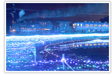 新高徳駅や大谷向駅、鬼怒川温泉駅などにイルミネーションが施される中、ひときわ人気を集めているのが、地域にお住いの方々が管理している「倉ケ崎SL花畑」エリア。畑いちめんにブルーに輝くイルミネーションが施され、その中を走る蒸気機関車はまさに幻想的。「銀河鉄道の夜」の世界にいるような感動を味わえます。